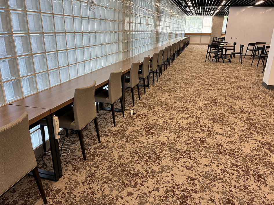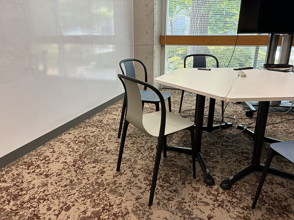 イノベーション・ラボの入り口を入ったところから、奥を写した。左のガラス窓の外は、明治通りに面している。にもかかわらず静かでカーペットをはじめ音響的な配慮をしているようだ。この空間は、時にパーティションで仕切られセミナーや研究室の発表会が催される。この奥には、かなり広いソファーが幾つも置かれ、その横に六つのミーティングル―ブが並んでいる。
